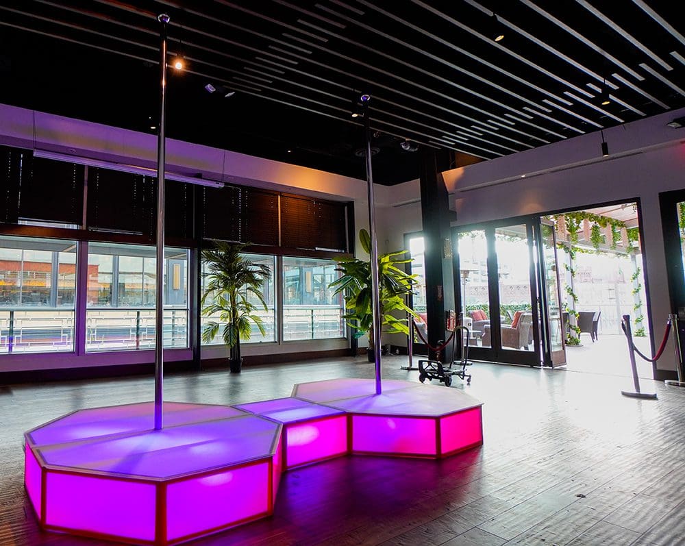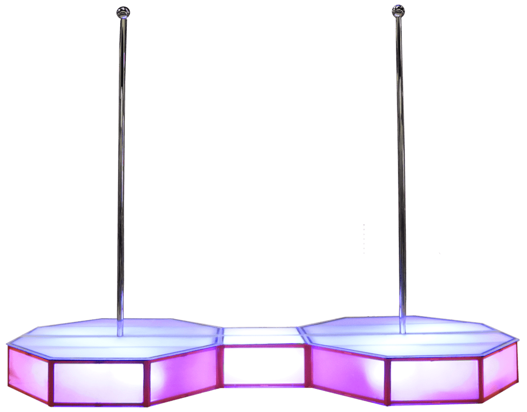 This professional double-stage catwalk combo, with mirrored non-sectional stainless steel poles is the most asked about and sought-after portable pole dance apparatus in existence.